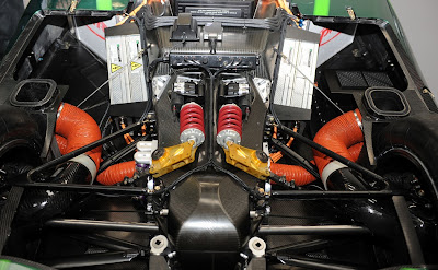The 700V A123 pack has a capacity of around 60 kWh. The battery pack powers four axial flux Oxford YASA motors via inverters supplied by Rinehart. The motors, up to 850 peak horsepower (634 kW) powering the rear wheels, are mounted in a similar longitudinal location to where the ICE powerplant would normally be located. There is a single speed reduction gearbox/differential linking the drive from the electric motors to the driveshafts.